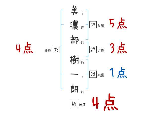 外運![]() | 美濃部樹一朗さんの外運は38画の4つ星!温厚な性格で技術的な才能を発揮する。職人的な仕事に向いている。 生活面を象徴する運勢です。外部から受ける影響力を表し、結婚運、家庭運や職場、環境への順応性を表します。 |