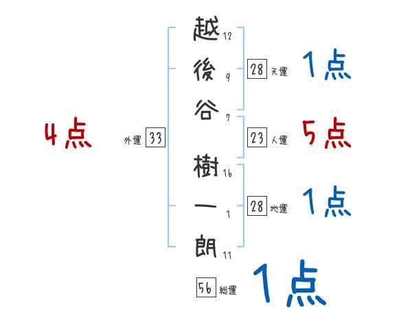 天運![]() | 越後谷樹一朗さんの天運は28画の1つ星!家庭環境に注意。スポーツで活躍できる能力があるかも。 家系が持つ宿命的な運勢を表します。祖先から受け継いだ苗字ですので自分の力が及びません。家柄を象徴します。 |