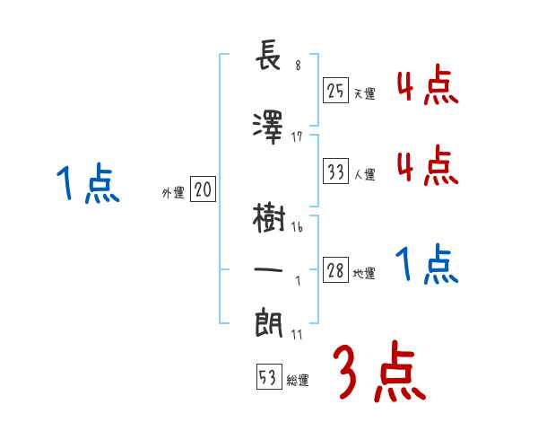 総運![]() | 長澤樹一朗さんの総運は53画の3つ星!やや見栄っ張りで虚栄心がある。散財に注意。 あなたの人生を表す1番重要な運勢です。生涯を通じて影響する総合運となり、主に50歳以降の晩年期に影響を及ぼします。 |