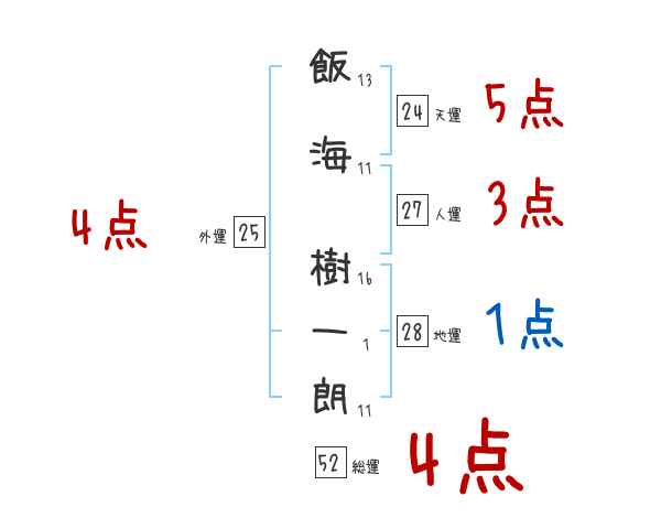 天運![]() | 飯海樹一朗さんの天運は24画の5つ星!家庭運が良く順調な人生。金運にも恵まれる。 家系が持つ宿命的な運勢を表します。祖先から受け継いだ苗字ですので自分の力が及びません。家柄を象徴します。 |