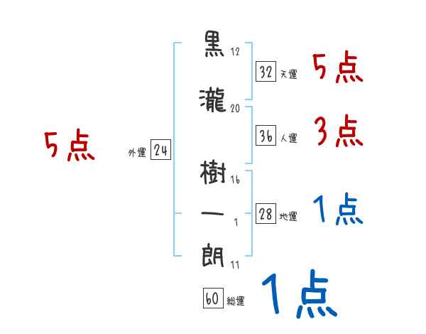 外運![]() | 黒瀧樹一朗さんの外運は24画の5つ星!家庭運が良く順調な人生。金運にも恵まれる。 生活面を象徴する運勢です。外部から受ける影響力を表し、結婚運、家庭運や職場、環境への順応性を表します。 |