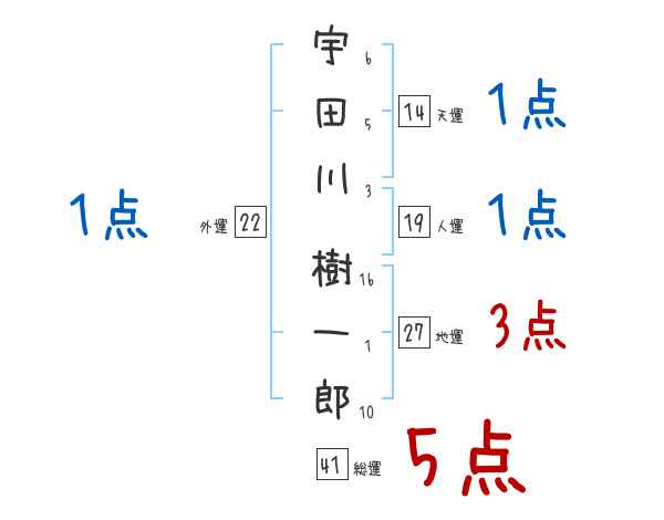 外運![]() | 宇田川樹一郎さんの外運は22画の1つ星!努力することが苦手ないっぽう手先が器用。芸術性にも優れる。 生活面を象徴する運勢です。外部から受ける影響力を表し、結婚運、家庭運や職場、環境への順応性を表します。 |