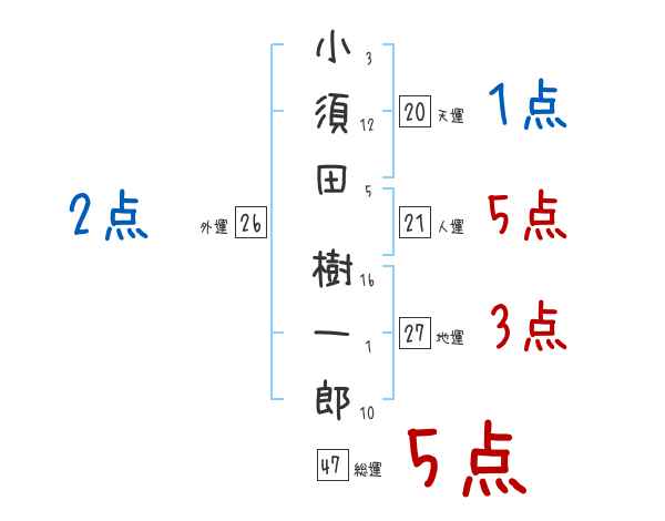 外運![]() | 小須田樹一郎さんの外運は26画の2つ星!波瀾万丈かも。信頼できる人を大事にしましょう。 生活面を象徴する運勢です。外部から受ける影響力を表し、結婚運、家庭運や職場、環境への順応性を表します。 |