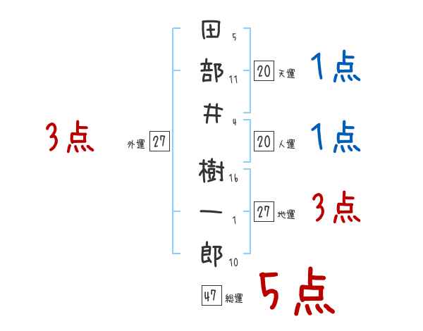 総運![]() | 田部井樹一郎さんの総運は47画の5つ星!実力が開花し発展する円満な人生。財に恵まれる。 あなたの人生を表す1番重要な運勢です。生涯を通じて影響する総合運となり、主に50歳以降の晩年期に影響を及ぼします。 |