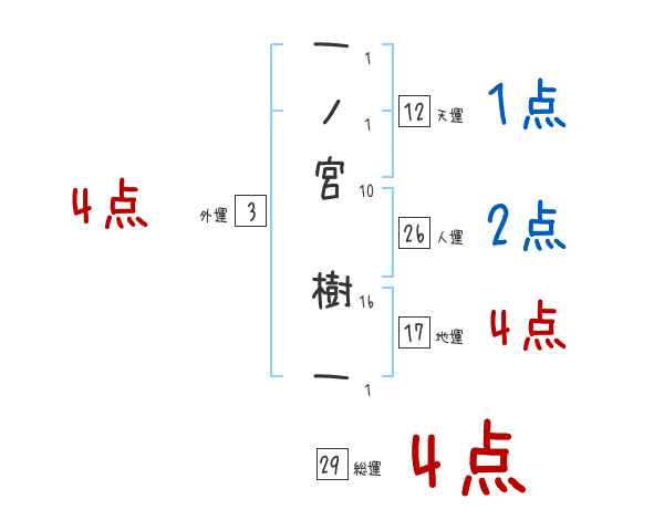 総運![]() | 一ノ宮樹一さんの総運は29画の4つ星!完全主義で才能がある。厳格な心の持ち主。 あなたの人生を表す1番重要な運勢です。生涯を通じて影響する総合運となり、主に50歳以降の晩年期に影響を及ぼします。 |