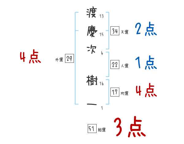 総運![]() | 渡慶次樹一さんの総運は51画の3つ星!変化が激しく、危険に注意。堅実な性格。 あなたの人生を表す1番重要な運勢です。生涯を通じて影響する総合運となり、主に50歳以降の晩年期に影響を及ぼします。 |