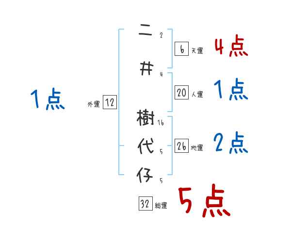 天運![]() | 二井樹代仔さんの天運は6画の4つ星!慎重な努力家で信頼を得る。誠実な精神で向上心に優れる。 家系が持つ宿命的な運勢を表します。祖先から受け継いだ苗字ですので自分の力が及びません。家柄を象徴します。 |