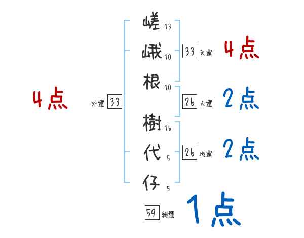 外運![]() | 嵯峨根樹代仔さんの外運は33画の4つ星!権力志向でプライドが高い。勇気があり運を切り開き成功する。 生活面を象徴する運勢です。外部から受ける影響力を表し、結婚運、家庭運や職場、環境への順応性を表します。 |