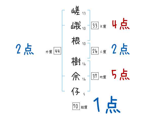 天運![]() | 嵯峨根樹余仔さんの天運は33画の4つ星!権力志向でプライドが高い。勇気があり運を切り開き成功する。 家系が持つ宿命的な運勢を表します。祖先から受け継いだ苗字ですので自分の力が及びません。家柄を象徴します。 |