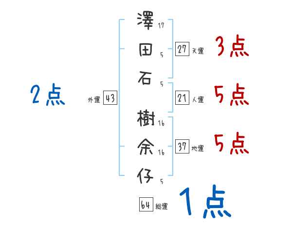地運![]() | 澤田石樹余仔さんの地運は37画の5つ星!努力家で順応性に優れる。現実的な考え方ができ忠実に物事をこなす。 個性を表す基礎的な運勢です。性格形成や対人関係、行動力など家庭環境に影響されます。主に誕生してから20歳くらいまでの若年期の運勢を表します。 |