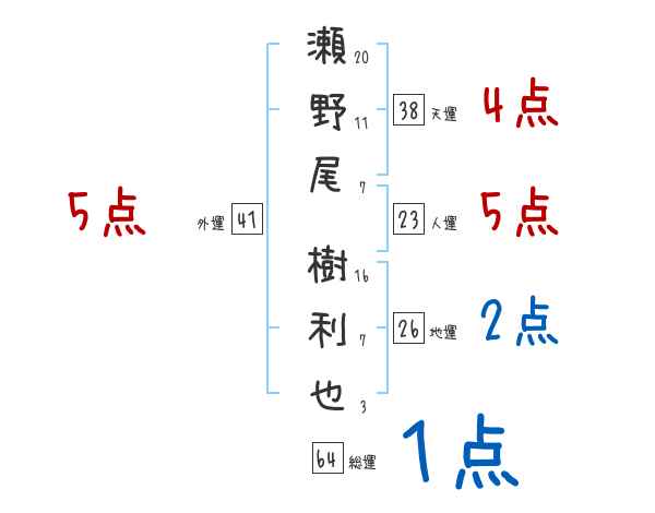 地運![]() | 瀬野尾樹利也さんの地運は26画の2つ星!波瀾万丈かも。信頼できる人を大事にしましょう。 個性を表す基礎的な運勢です。性格形成や対人関係、行動力など家庭環境に影響されます。主に誕生してから20歳くらいまでの若年期の運勢を表します。 |