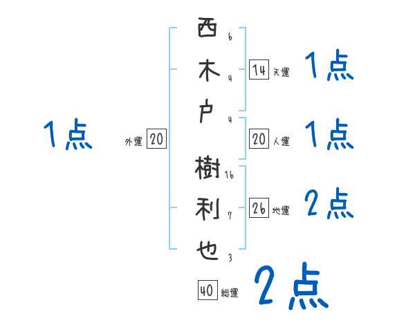 総運![]() | 西木戸樹利也さんの総運は40画の2つ星!自信過剰で物事に固執するためトラブルに注意。 あなたの人生を表す1番重要な運勢です。生涯を通じて影響する総合運となり、主に50歳以降の晩年期に影響を及ぼします。 |