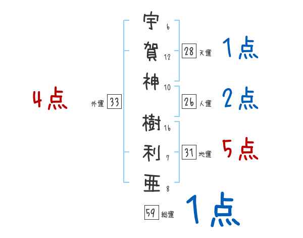 宇賀神樹利亜さんの画数の鑑定結果