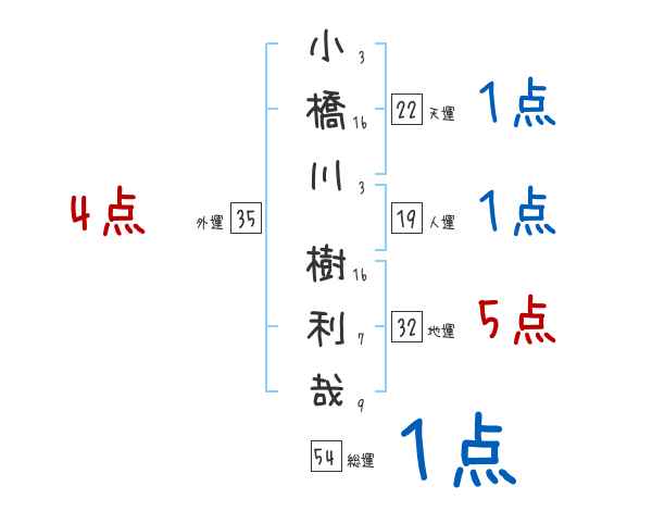 外運![]() | 小橋川樹利哉さんの外運は35画の4つ星!温厚な性格で感受性が高い。穏和な性格で人望が厚い。 生活面を象徴する運勢です。外部から受ける影響力を表し、結婚運、家庭運や職場、環境への順応性を表します。 |