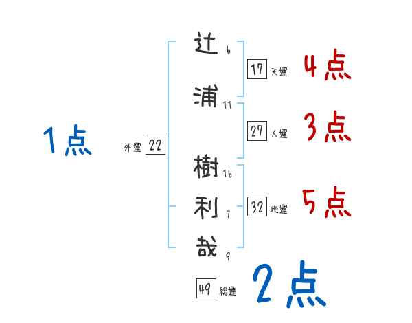天運![]() | 辻浦樹利哉さんの天運は17画の4つ星!積極的な行動力。地位を気づき財産を手に入れる。純粋な心と直感力。 家系が持つ宿命的な運勢を表します。祖先から受け継いだ苗字ですので自分の力が及びません。家柄を象徴します。 |