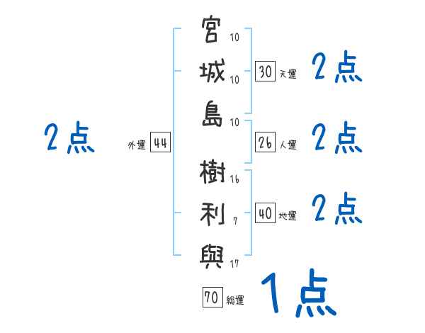 天運![]() | 宮城島樹利與さんの天運は30画の2つ星!浮き沈みの激しさに注意しましょう。 家系が持つ宿命的な運勢を表します。祖先から受け継いだ苗字ですので自分の力が及びません。家柄を象徴します。 |