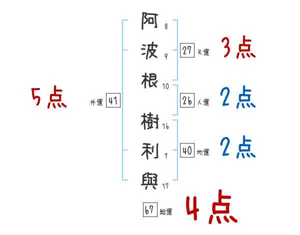 天運![]() | 阿波根樹利與さんの天運は27画の3つ星!頭脳明晰だが強情で摩擦が多い傾向。孤立に注意。 家系が持つ宿命的な運勢を表します。祖先から受け継いだ苗字ですので自分の力が及びません。家柄を象徴します。 |
