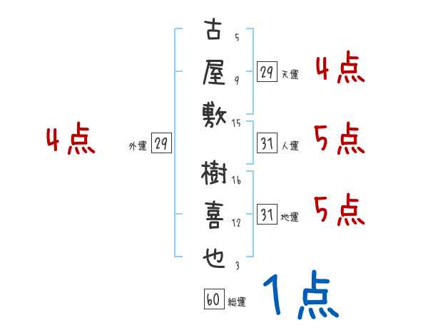 天運![]() | 古屋敷樹喜也さんの天運は29画の4つ星!完全主義で才能がある。厳格な心の持ち主。 家系が持つ宿命的な運勢を表します。祖先から受け継いだ苗字ですので自分の力が及びません。家柄を象徴します。 |