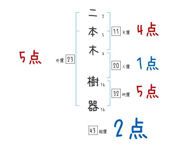 地運![]() | 二本木樹器さんの地運は32画の5つ星!柔軟性があり成功する。チャンスが多く金運が良い。 個性を表す基礎的な運勢です。性格形成や対人関係、行動力など家庭環境に影響されます。主に誕生してから20歳くらいまでの若年期の運勢を表します。 |