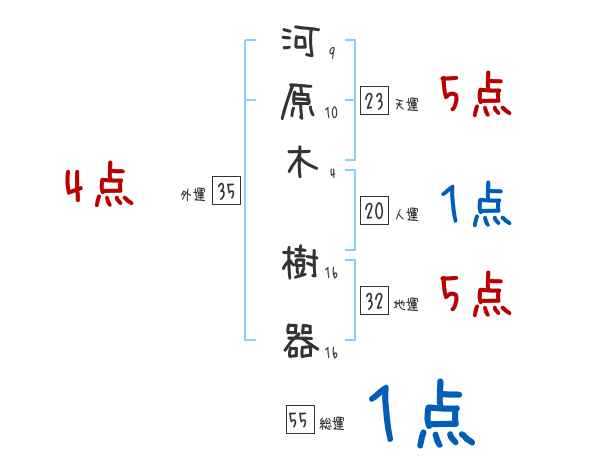 天運![]() | 河原木樹器さんの天運は23画の5つ星!想像力に優れ活力がある。一代で成功し名誉を手に入れる。 家系が持つ宿命的な運勢を表します。祖先から受け継いだ苗字ですので自分の力が及びません。家柄を象徴します。 |