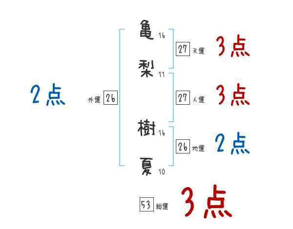 総運![]() | 亀梨樹夏さんの総運は53画の3つ星!やや見栄っ張りで虚栄心がある。散財に注意。 あなたの人生を表す1番重要な運勢です。生涯を通じて影響する総合運となり、主に50歳以降の晩年期に影響を及ぼします。 |