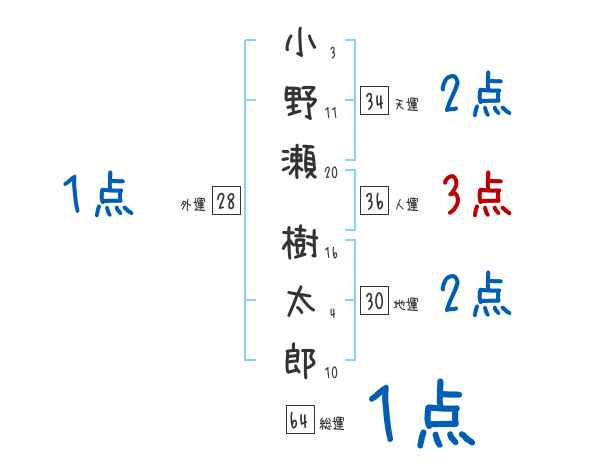 人運![]() | 小野瀬樹太郎さんの人運は36画の3つ星!先見性が豊かです。多少神経質で苦労することも。 性格や才能などを表す2番目に重要な運勢です。人間関係や協調性、社会的な成功に影響します。主に20歳から50歳ぐらいまでの中年期の運勢を表します。 |