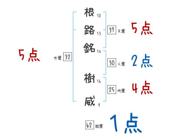外運![]() | 根路銘樹威さんの外運は32画の5つ星!柔軟性があり成功する。チャンスが多く金運が良い。 生活面を象徴する運勢です。外部から受ける影響力を表し、結婚運、家庭運や職場、環境への順応性を表します。 |