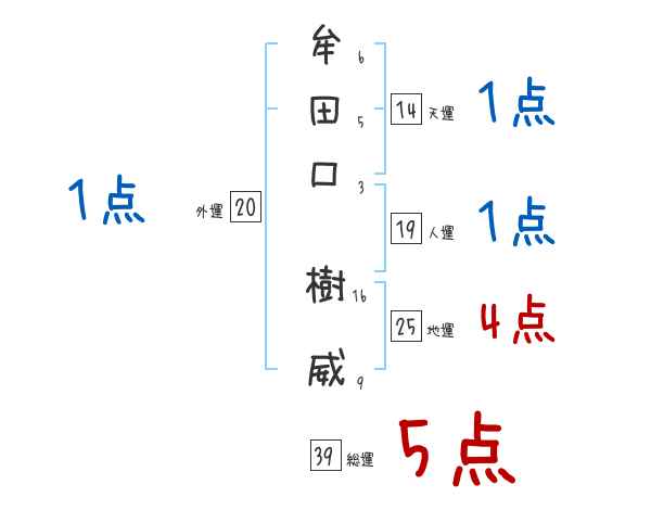 天運![]() | 牟田口樹威さんの天運は14画の1つ星!人に対して優しいがストレスを溜め込みがち。人間関係のトラブルを避けるよう気をつけましょう。 家系が持つ宿命的な運勢を表します。祖先から受け継いだ苗字ですので自分の力が及びません。家柄を象徴します。 |