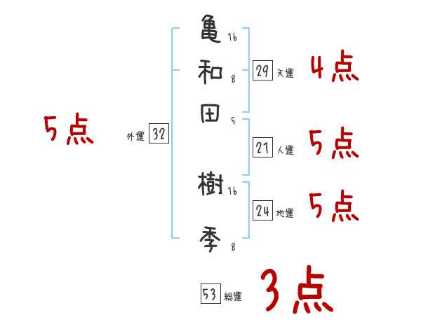 外運![]() | 亀和田樹季さんの外運は32画の5つ星!柔軟性があり成功する。チャンスが多く金運が良い。 生活面を象徴する運勢です。外部から受ける影響力を表し、結婚運、家庭運や職場、環境への順応性を表します。 |