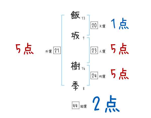 外運![]() | 飯坂樹季さんの外運は21画の5つ星!統率力がある。独立し成功する。名誉を手に入れる。 生活面を象徴する運勢です。外部から受ける影響力を表し、結婚運、家庭運や職場、環境への順応性を表します。 |