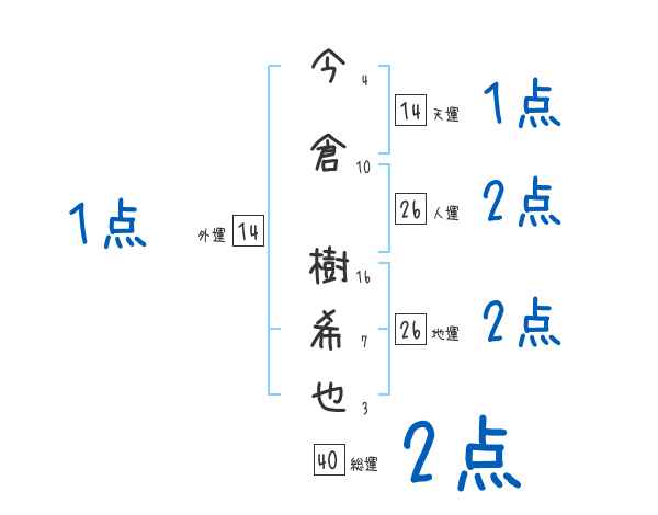 外運![]() | 今倉樹希也さんの外運は14画の1つ星!人に対して優しいがストレスを溜め込みがち。人間関係のトラブルを避けるよう気をつけましょう。 生活面を象徴する運勢です。外部から受ける影響力を表し、結婚運、家庭運や職場、環境への順応性を表します。 |
