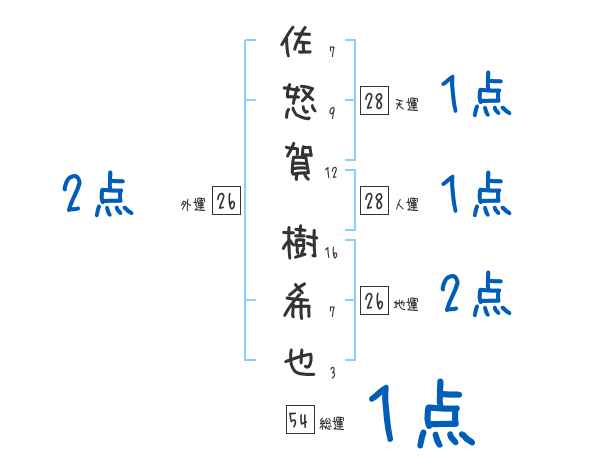 地運![]() | 佐怒賀樹希也さんの地運は26画の2つ星!波瀾万丈かも。信頼できる人を大事にしましょう。 個性を表す基礎的な運勢です。性格形成や対人関係、行動力など家庭環境に影響されます。主に誕生してから20歳くらいまでの若年期の運勢を表します。 |