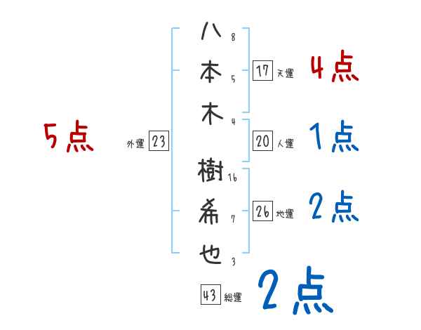総運![]() | 八本木樹希也さんの総運は43画の2つ星!頑固な性格で独立心が強いかも。やや非現実的で浪費に注意しましょう。 あなたの人生を表す1番重要な運勢です。生涯を通じて影響する総合運となり、主に50歳以降の晩年期に影響を及ぼします。 |