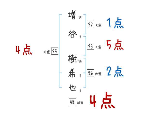 天運![]() | 増谷樹希也さんの天運は22画の1つ星!努力することが苦手ないっぽう手先が器用。芸術性にも優れる。 家系が持つ宿命的な運勢を表します。祖先から受け継いだ苗字ですので自分の力が及びません。家柄を象徴します。 |