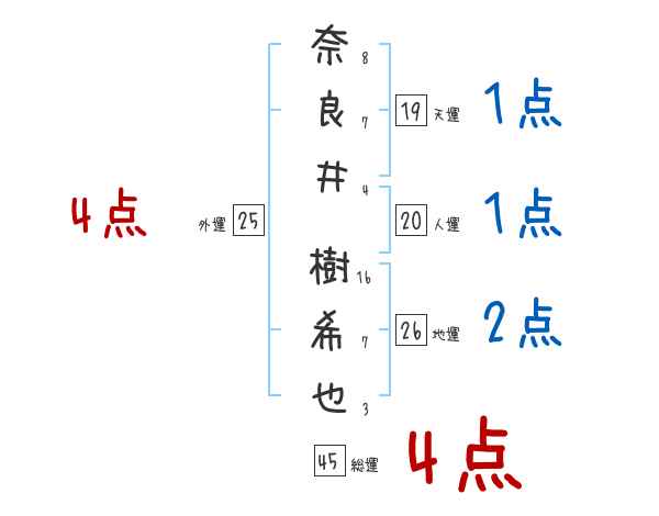 地運![]() | 奈良井樹希也さんの地運は26画の2つ星!波瀾万丈かも。信頼できる人を大事にしましょう。 個性を表す基礎的な運勢です。性格形成や対人関係、行動力など家庭環境に影響されます。主に誕生してから20歳くらいまでの若年期の運勢を表します。 |