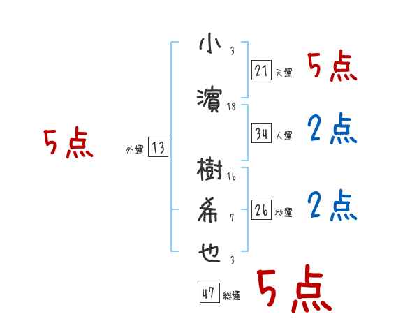 天運![]() | 小濵樹希也さんの天運は21画の5つ星!統率力がある。独立し成功する。名誉を手に入れる。 家系が持つ宿命的な運勢を表します。祖先から受け継いだ苗字ですので自分の力が及びません。家柄を象徴します。 |