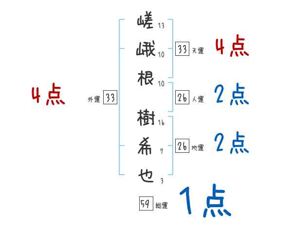 総運![]() | 嵯峨根樹希也さんの総運は59画の1つ星!意志の弱さであきらめることが多いかも。粘り強さが必要。 あなたの人生を表す1番重要な運勢です。生涯を通じて影響する総合運となり、主に50歳以降の晩年期に影響を及ぼします。 |