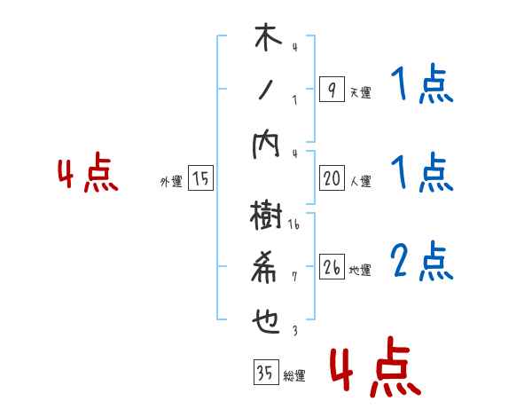 総運![]() | 木ノ内樹希也さんの総運は35画の4つ星!温厚な性格で感受性が高い。穏和な性格で人望が厚い。 あなたの人生を表す1番重要な運勢です。生涯を通じて影響する総合運となり、主に50歳以降の晩年期に影響を及ぼします。 |