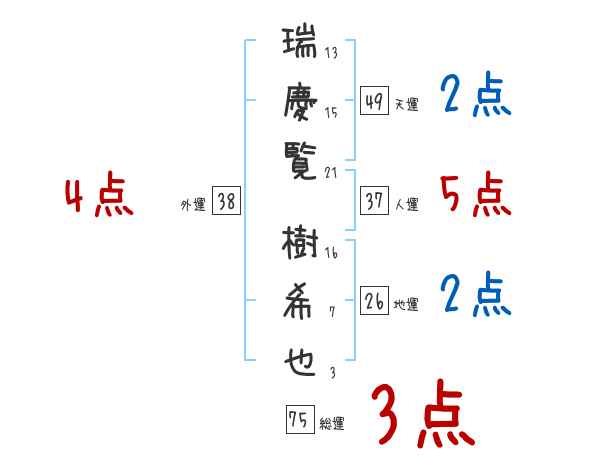 天運![]() | 瑞慶覧樹希也さんの天運は49画の2つ星!不安定な性格で明暗がある人生。周りの人には支援されやすい。 家系が持つ宿命的な運勢を表します。祖先から受け継いだ苗字ですので自分の力が及びません。家柄を象徴します。 |