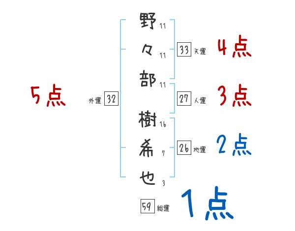 天運![]() | 野々部樹希也さんの天運は33画の4つ星!権力志向でプライドが高い。勇気があり運を切り開き成功する。 家系が持つ宿命的な運勢を表します。祖先から受け継いだ苗字ですので自分の力が及びません。家柄を象徴します。 |