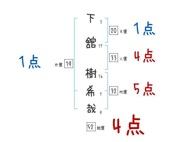 地運![]() | 下舘樹希哉さんの地運は32画の5つ星!柔軟性があり成功する。チャンスが多く金運が良い。 個性を表す基礎的な運勢です。性格形成や対人関係、行動力など家庭環境に影響されます。主に誕生してから20歳くらいまでの若年期の運勢を表します。 |