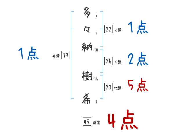 総運![]() | 多々納樹希さんの総運は45画の4つ星!もくもくと物事を進め達成する。地味な努力家。 あなたの人生を表す1番重要な運勢です。生涯を通じて影響する総合運となり、主に50歳以降の晩年期に影響を及ぼします。 |
