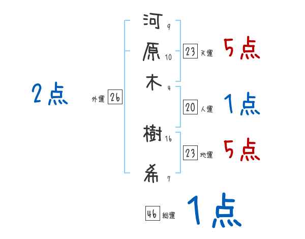 天運![]() | 河原木樹希さんの天運は23画の5つ星!想像力に優れ活力がある。一代で成功し名誉を手に入れる。 家系が持つ宿命的な運勢を表します。祖先から受け継いだ苗字ですので自分の力が及びません。家柄を象徴します。 |