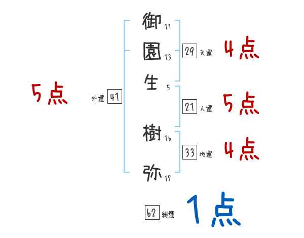 人運![]() | 御園生樹弥さんの人運は21画の5つ星!統率力がある。独立し成功する。名誉を手に入れる。 性格や才能などを表す2番目に重要な運勢です。人間関係や協調性、社会的な成功に影響します。主に20歳から50歳ぐらいまでの中年期の運勢を表します。 |
