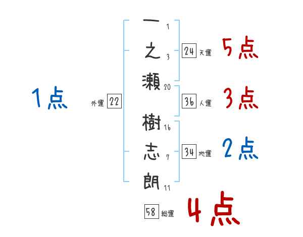 総運![]() | 一之瀬樹志朗さんの総運は58画の4つ星!安定した生活。大器晩成タイプ。 あなたの人生を表す1番重要な運勢です。生涯を通じて影響する総合運となり、主に50歳以降の晩年期に影響を及ぼします。 |
