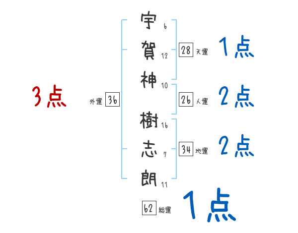 天運![]()  | 宇賀神樹志朗さんの天運は28画の1つ星!家庭環境に注意。スポーツで活躍できる能力があるかも。 家系が持つ宿命的な運勢を表します。祖先から受け継いだ苗字ですので自分の力が及びません。家柄を象徴します。 |