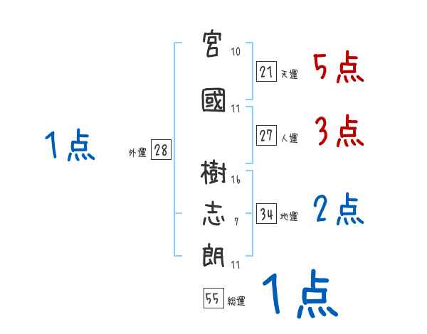 天運![]() | 宮國樹志朗さんの天運は21画の5つ星!統率力がある。独立し成功する。名誉を手に入れる。 家系が持つ宿命的な運勢を表します。祖先から受け継いだ苗字ですので自分の力が及びません。家柄を象徴します。 |