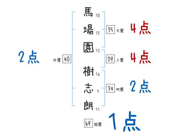総運![]() | 馬場園樹志朗さんの総運は69画の1つ星!不満を感じやすい傾向が。ストレスを貯めないように注意しましょう。 あなたの人生を表す1番重要な運勢です。生涯を通じて影響する総合運となり、主に50歳以降の晩年期に影響を及ぼします。 |