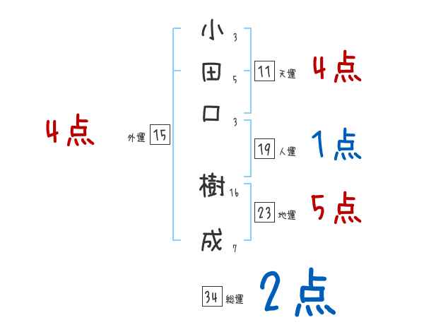 総運![]() | 小田口樹成さんの総運は34画の2つ星!独創性に優れるが、自尊心が強く災難に注意しましょう。 あなたの人生を表す1番重要な運勢です。生涯を通じて影響する総合運となり、主に50歳以降の晩年期に影響を及ぼします。 |