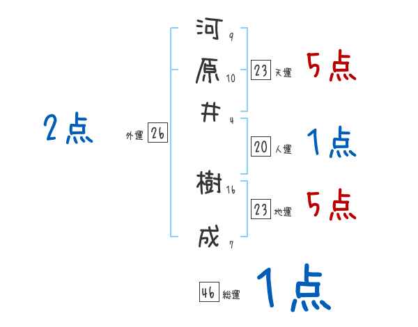 天運![]() | 河原井樹成さんの天運は23画の5つ星!想像力に優れ活力がある。一代で成功し名誉を手に入れる。 家系が持つ宿命的な運勢を表します。祖先から受け継いだ苗字ですので自分の力が及びません。家柄を象徴します。 |
